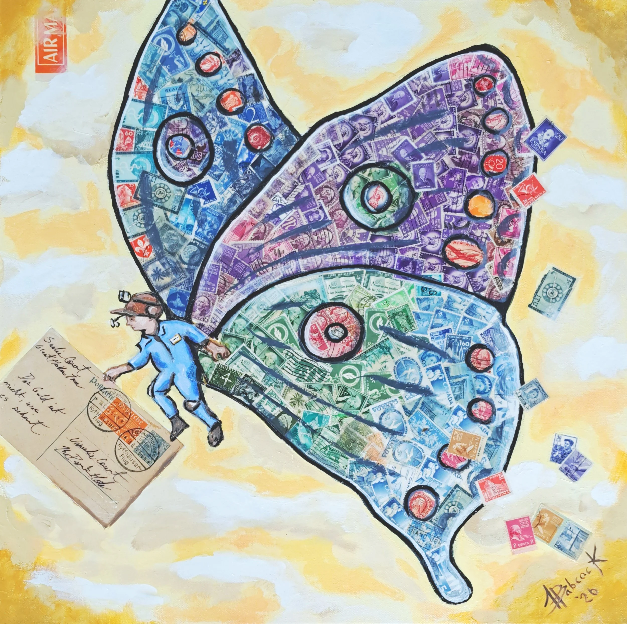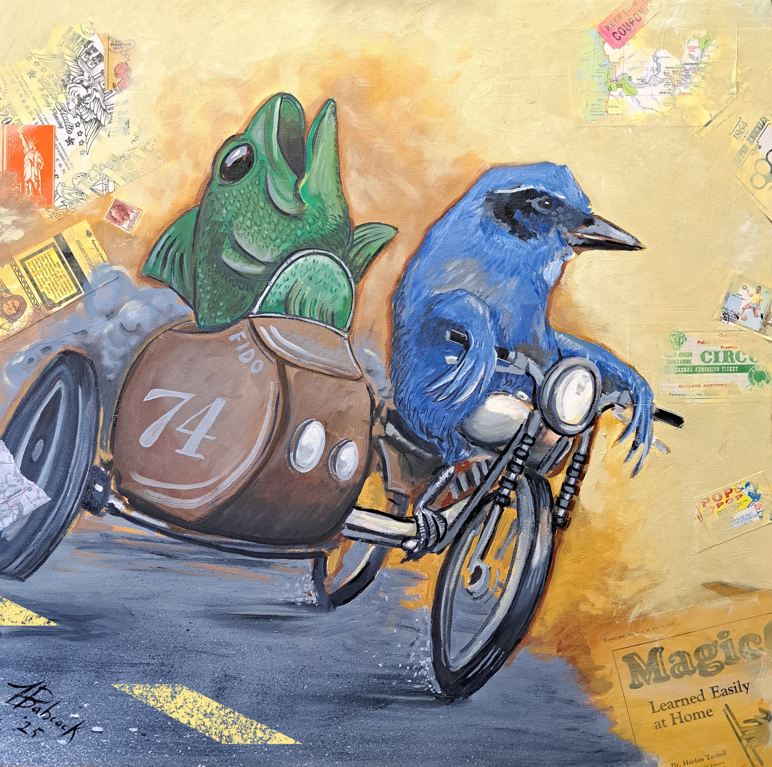 Fish said to Bird, “Bird, I am so bored!” Bird replied “Hang on, I got an idea”. 24”×24”. Oil over acrylics and selected collage work.
